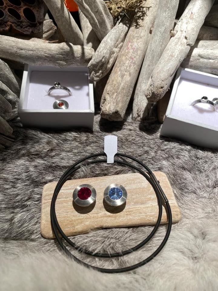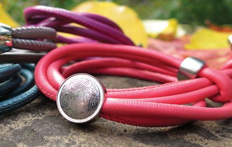 Auf den Bildern sehen Sie Schmuckstücke, die wir selber tragen. Bei der Kette handelt es sich um einen mehrsträngigen Rotgoldreif mit passendem Hänger in Rotgold und Edelstahl. Das Armband ist ein Lederband mit passendem Anhänger aus Edelstahl. Außerdem sehen Sie hier ein Beispiel eines Fingerabdrucks.