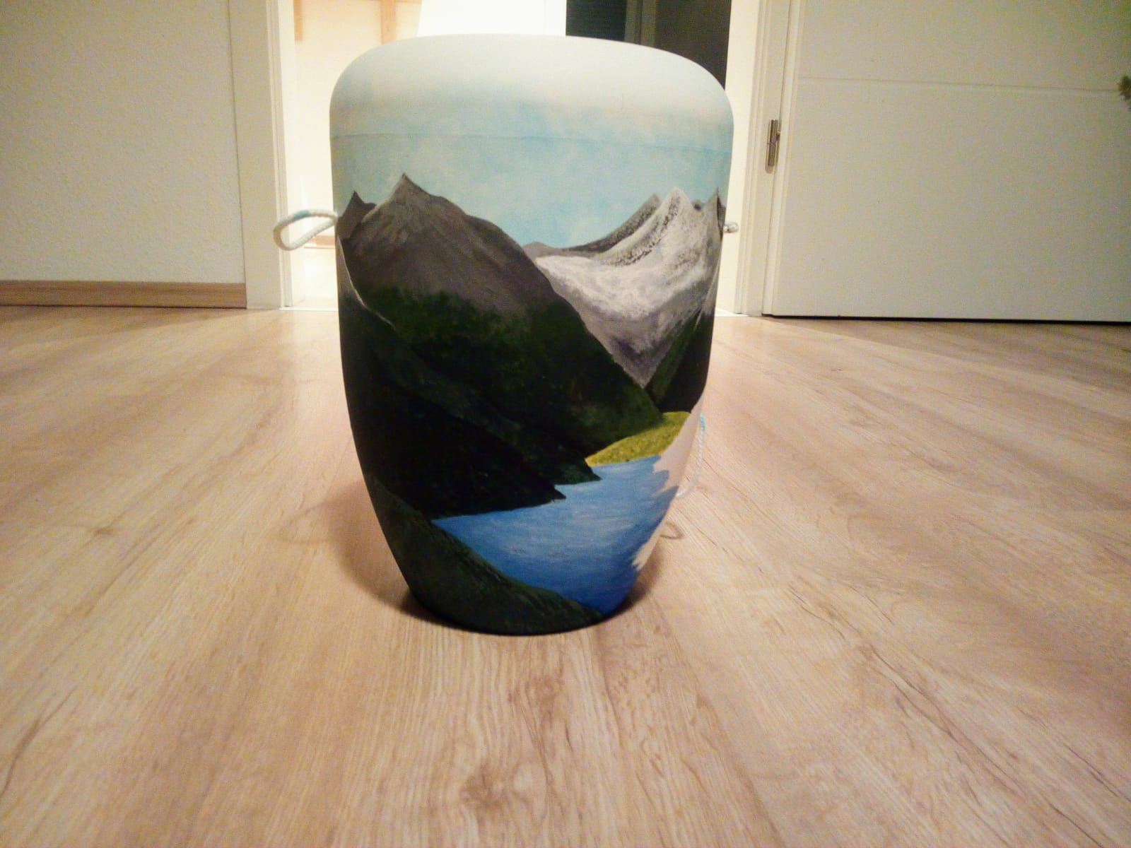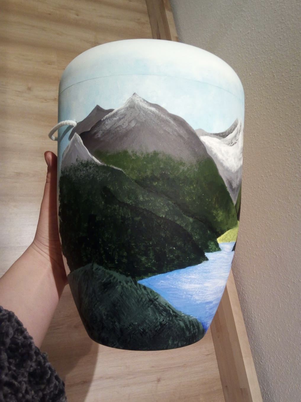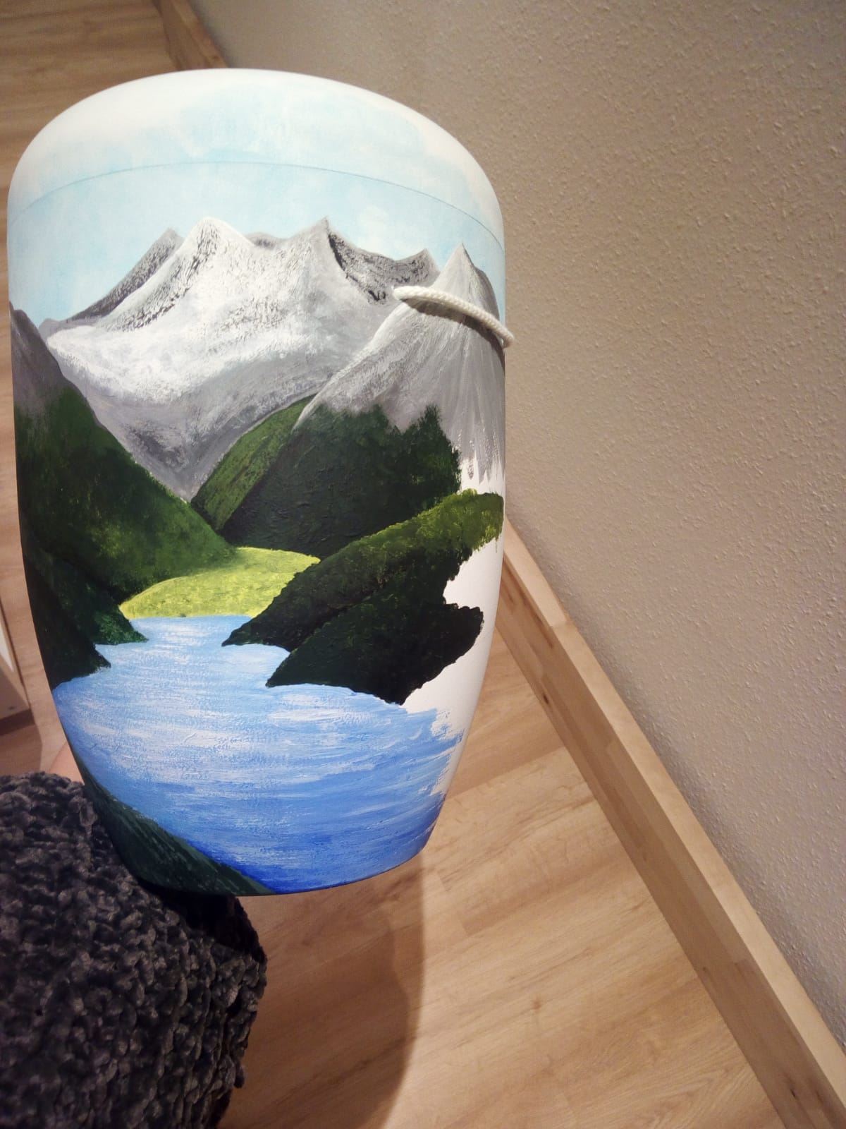 Der Wunsch der Enkelin des Verstorbenen war, die Urne selber zu gestalten und zu bemalen. Diese Frage stellte sie während des Trauergespräches und fragte, ob dies möglich sei. Geht nicht, gibt es eigentlich nicht und so fand die Verbundenheit zu ihrem Opa Ausdruck in einem Motiv, welches eine Berglandschaft mit Wiese und einem Bergsee zeigt. Ein absolut tolles Ergebnis, oder?