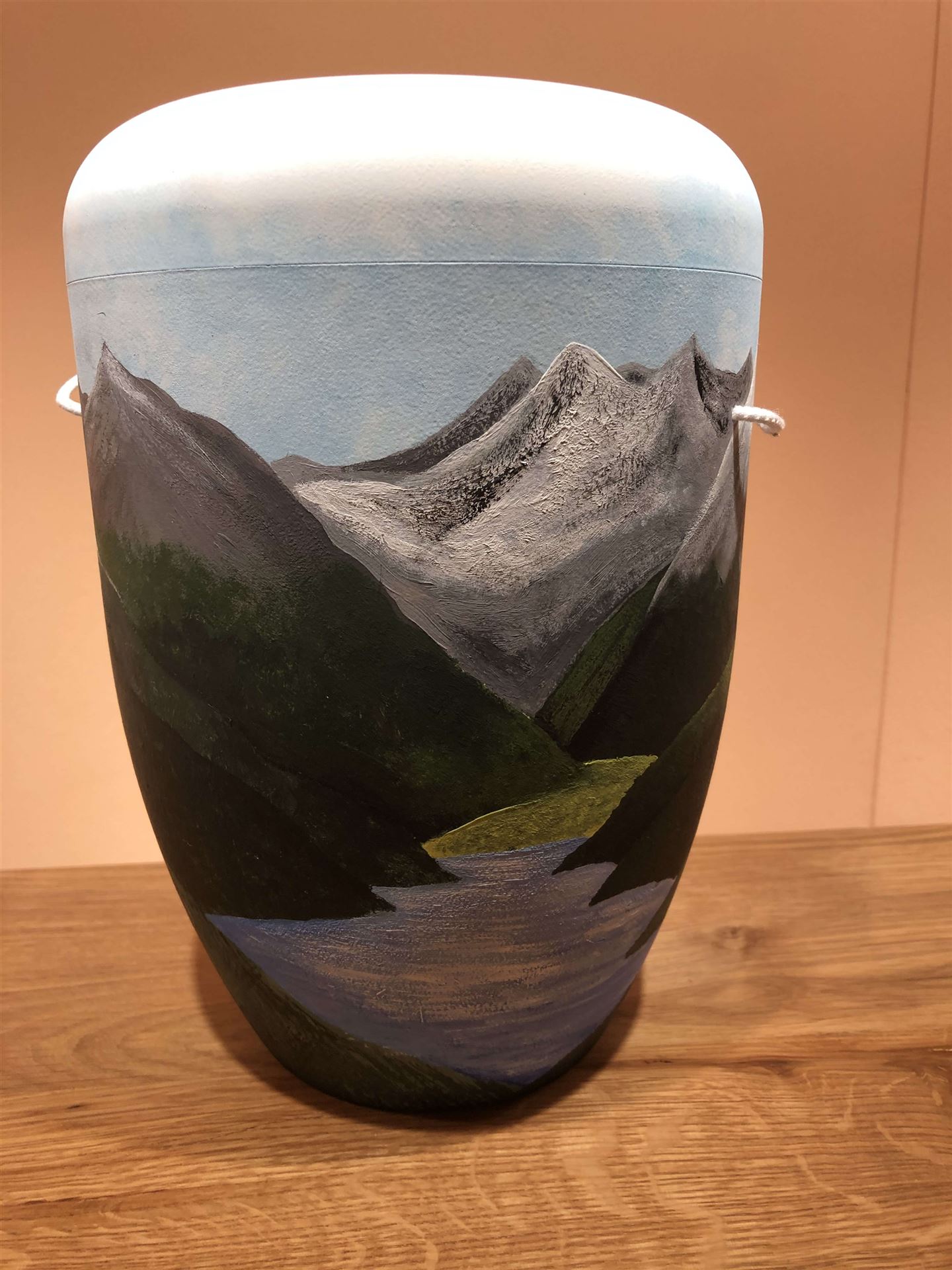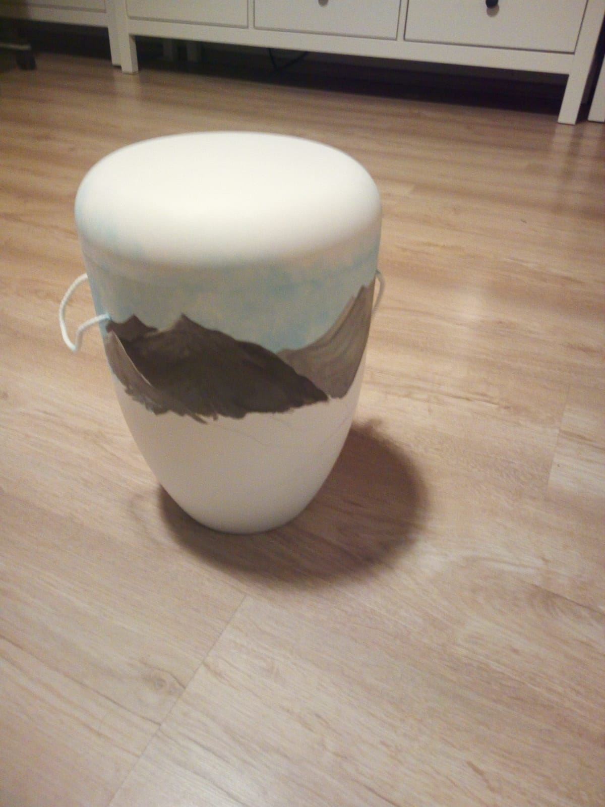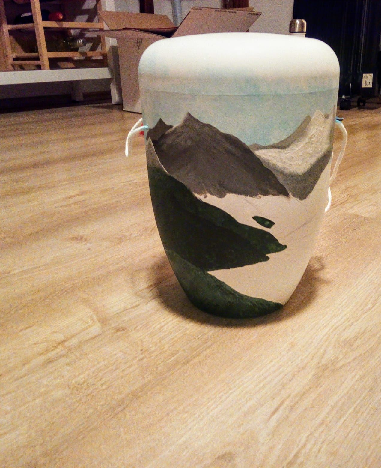 Der Wunsch der Enkelin des Verstorbenen war, die Urne selber zu gestalten und zu bemalen. Diese Frage stellte sie während des Trauergespräches und fragte, ob dies möglich sei. Geht nicht, gibt es eigentlich nicht und so fand die Verbundenheit zu ihrem Opa Ausdruck in einem Motiv, welches eine Berglandschaft mit Wiese und einem Bergsee zeigt. Ein absolut tolles Ergebnis, oder?