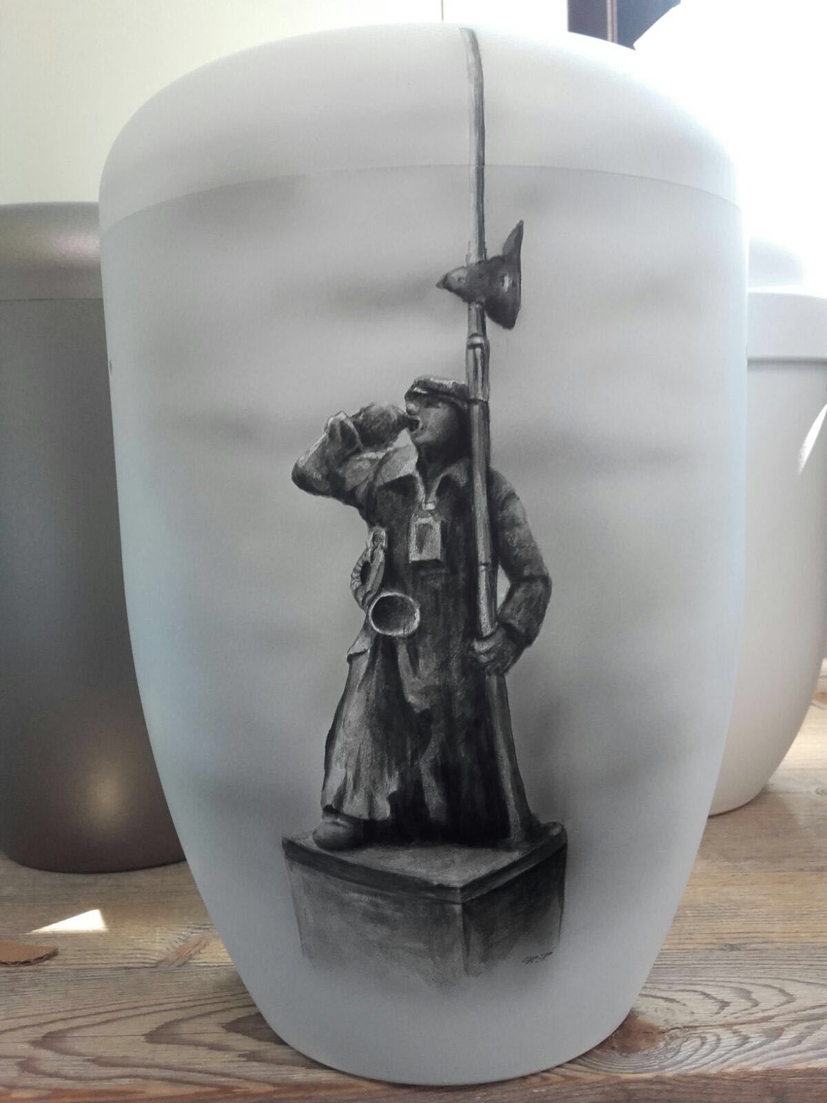 Hier wurde meine Idee einer Ehrennachtwächter-Urne für den Heimatverein Voerde umgesetzt. Vorlage war ein Foto des Ehrennachtwächter-Denkmals am Haus der Begegnung gegenüber unseres Geschäftes auf der Lindenstraße in Ennepetal-Voerde. Dieses Motiv wurde nun auf eine Urne geairbrushed und somit ist jede Urne ein absolutes Unikat. Das Foto zeigt die Ausführung auf einer Bio-Urne. Diese befindet sich derzeit als Leihgabe im Museum des Ehrennachtwächters 2016 des Heimatvereins Ennepetal-Voerde Dr. Roman Kruzycki in der Mittelstraße in Ennepetal-Altenvoerde. In unserem Geschäft ist diese Urne in Keramik in der Ausstellung.
